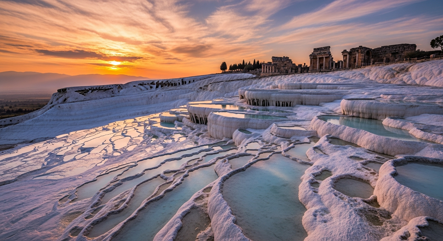 Pamukkale is a breathtaking natural site in southwestern Turkey, famous for its carbonate mineral terraces left by the flowing of thermal spring water. Known as the 'Cotton Castle,' this UNESCO World Heritage site offers a visual spectacle of white forest-like cascades and petrified waterfalls that have been forming for millennia. Beyond its natural beauty, the area is steeped in ancient history. Built atop the white 'castle' is the Hellenistic spa city of Hierapolis, where visitors can explore remarkably preserved theaters, necropolises, and baths. Whether you are looking to soak in mineral-rich waters or walk through the footsteps of Roman emperors, Pamukkale provides an unforgettable journey through time and nature.